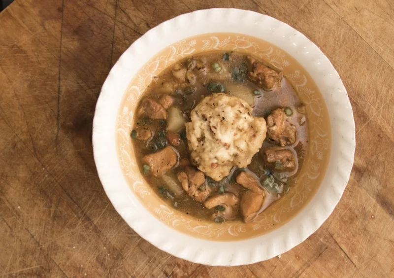 I find us and the Acadians have a special bond, similar to long-lost cousins. Obviously, their way of life is very different from ours. I have a feeling our summers would destroy them and their Winters, well I don’t even want to think about it. They have almost opposite living conditions than we do. I dream of the day I can go visit where my ancestors came from. Until then I connect through food. They have a dish called Chicken Fricot. It’s like a chicken soup with dumplings. As I researched I realized, while tasty, I would have to change some things to please their Cajun cousins. First, I reduced the savory herb in it. It's definitely an acquired taste that we are not used to. Then, of course, I had to add smoked Cajun sausage and spice (y’all are probably sensing a theme for Cajuns). Then it hit me - what if I put minced sausage in the dumplings? Like the sausage bread that is so popular here. I don’t get a lot of genius moments and wish more of them involved money making schemes and less food ideas but this is the card I was dealt. So here it is my Cajuned up Chicken Fricot with sausage dumplings.